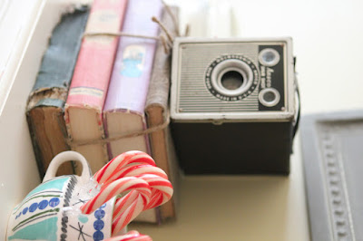 Love the red candy canes in the blue cup. Plus one of my cameras from my antique camera collection. (photographer + lover of vintage = antique camera collector...)